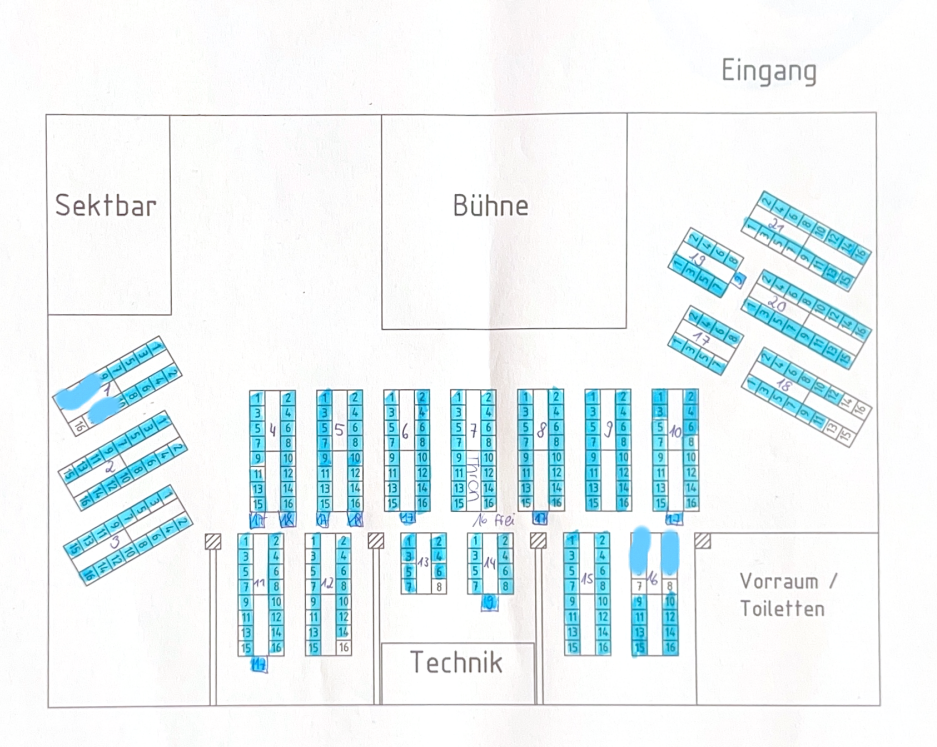 3... 2... 1... meins! Hier habt Ihr einen Sitzplan der Halle, auf dem Ihr sehen könnt, welche Plätze bereits vergeben oder reserviert sind. Immer daran denken, wer zuerst kommt, mahlt zuerst. Endspurt, schnell noch einen der letzten Plätze sichern!